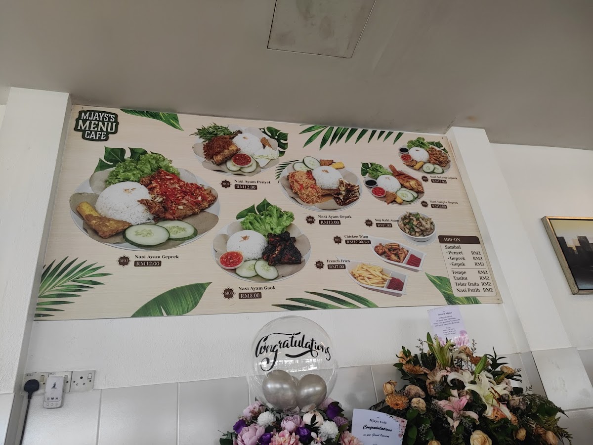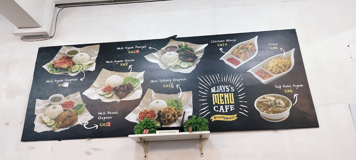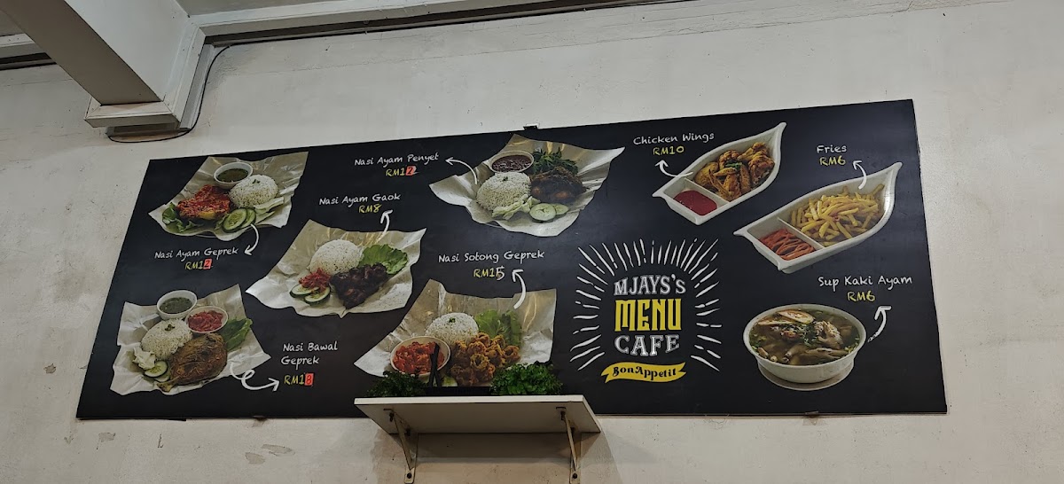 The menu at MJAYS CAFE offers a selection of local Malaysian dishes, focusing primarily on traditional rice and noodle-based meals. It is organized into main dishes and side orders, providing options for full meals as well as complementary accompaniments.